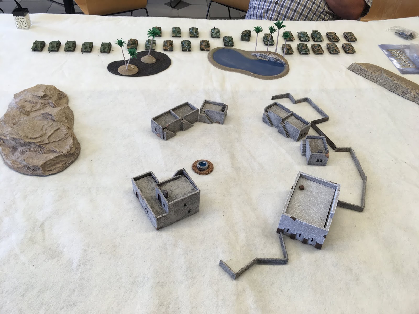 I also played a demo of the game Judgement. Judgement is a MOBA inspired miniatures game that uses 54mm figures. The models for the game look amazing. The object of the game is to battle with a team of figures and to either collect souls or or destroy the opposing team's base. I have no experience with MOBAs, but I could see the video game influences on gameplay. Dead characters respawn at their base and there are game mechanics that involve pushing characters around the field. The demo game that I played used MuseOnMinis tokens and neoprene playmats which made for an aesthetically pleasing experience.